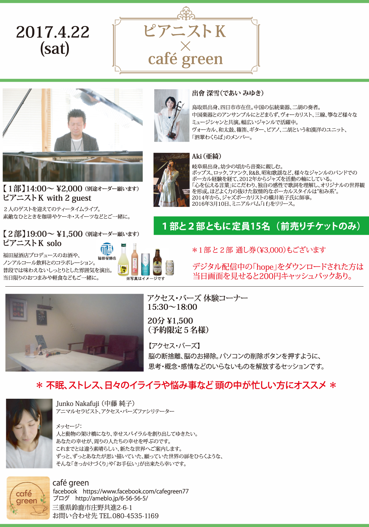 4/22(日)鈴鹿のCafe Greenさんで行われる、ピアニストKさんのライヴに一部でゲスト出演させていただきます。