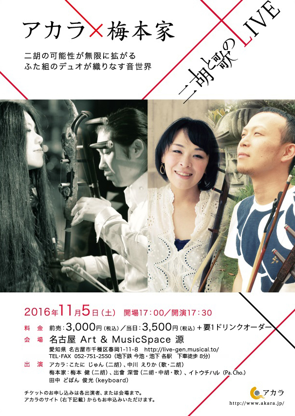 東京で活躍されている、二胡と歌のユニット「アカラ」のお二人が名古屋でライヴをされますー!