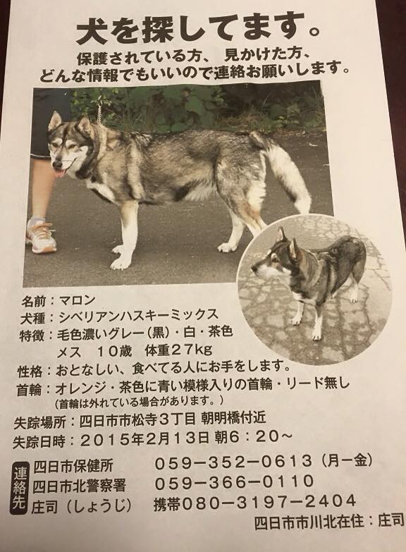 地域は三重県四日市市周辺になると思いますが、もう一ケ月経っていますので、他遠方の方でももしやと思われましたらご連絡くださいませ。