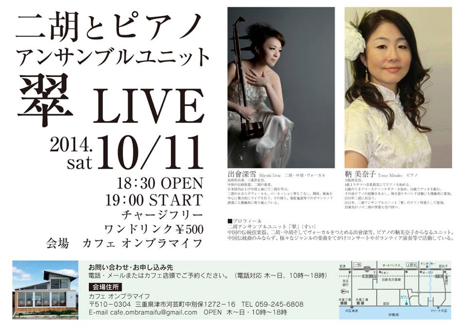 三重県津市の、カフェ オンブラマイフさんでライヴをします。