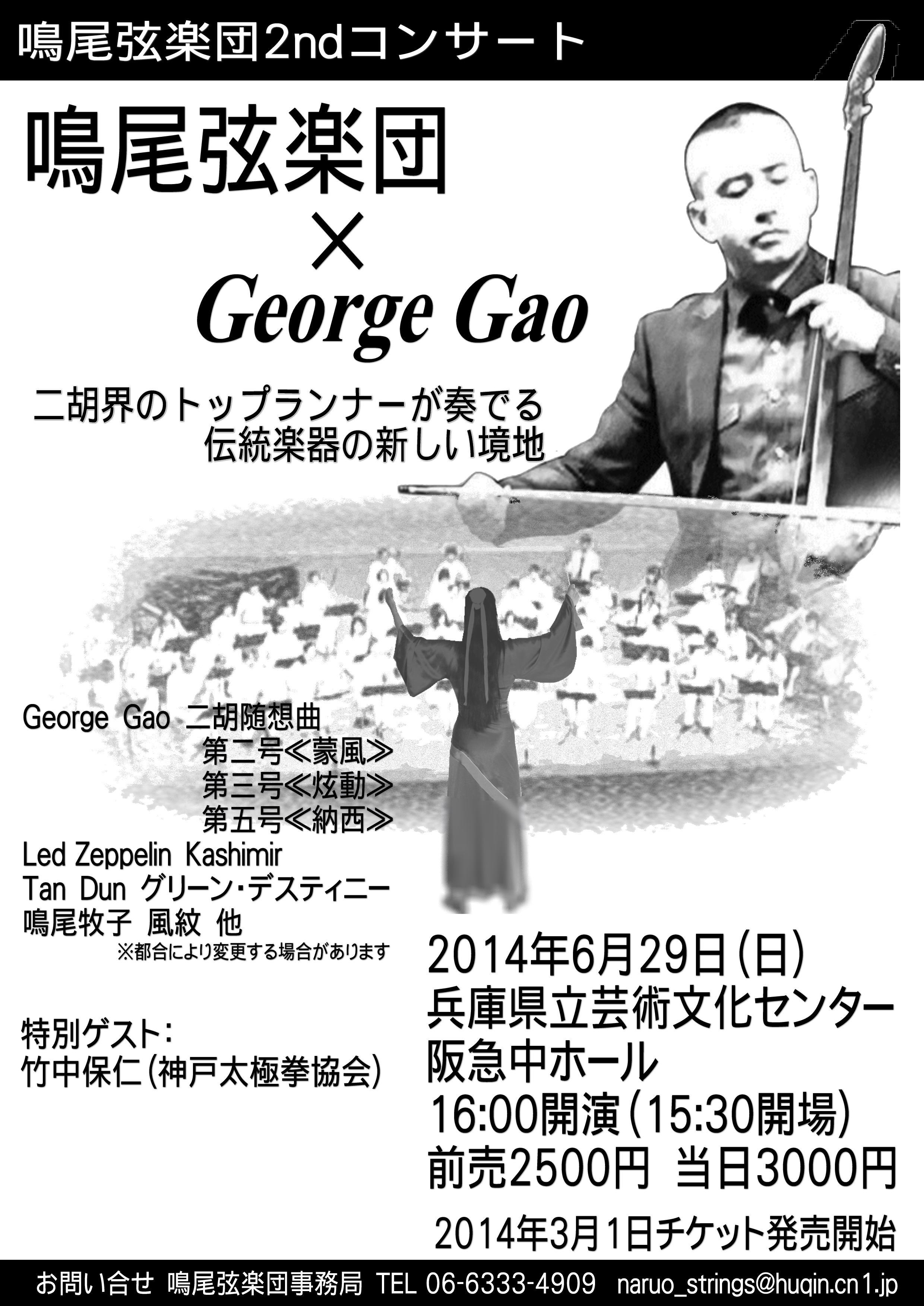 2014/01/27 Category : 演奏予定・お知らせ 鳴尾弦楽団2ndコンサートwithジョージ・ガオ! 私も所属しております、鳴尾弦楽団セカンドコンサートのお知らせです。 今回はあのジョージ・ガオ氏をゲストにお招きしてのコンサートです! ジョージ氏の代表曲をはじめとして、恒例の「え?二胡でこの曲くを!?」というびっくりをお届けします。 二胡という楽器のイメージが変わります。そこはこの楽団、普通なことはしません・・・ そこは(そこだけは!)自信を持っておりますよ! というわけで、ご興味がわかれた方はわたくし宛、または下記のお問い合わせ先までご連絡くださいませ。 よろしくお願いします。 鳴尾弦楽団2ndコンサート 鳴尾弦楽団×ジョージ・ガオ 二胡界のトップランナーが奏でる 伝統楽器の新しい境地 2014年6月29日(日) 兵庫県立芸術文化センター 中ホール 15:30開場 16:00開演 前売り2500円 当日3000円 演奏予定曲 ジョージ・ガオ 二胡随想曲第二号「蒙風」 第三号「炫動」 第五号「納西」 Led Zeppelin「Kashimir」 Tan Dun 「グリーン・ディスティニー」 鳴尾牧子「風紋」 ほか ※演目は変更する場合がございます。 お問い合わせ 鳴尾弦楽団事務局 06-6333-4909 naruo_strings@huqin.cn1.jp http://deaimiyuki.ko-me.com/%E6%BC%94%E5%A5%8F%E4%BA%88%E5%AE%9A%E3%83%BB%E3%81%8A%E7%9F%A5%E3%82%89%E3%81%9B/%E9%B3%B4%E5%B0%BE%E5%BC%A6%E6%A5%BD%E5%9B%A32nd%E3%82%B3%E3%83%B3%E3%82%B5%E3%83%BC%E3%83%88with%E3%82%B8%E3%83%A7%E3%83%BC%E3%82%B8%E3%83%BB%E3%82%AC%E3%82%AA%EF%BC%81鳴尾弦楽団2ndコンサートwithジョージ・ガオ!